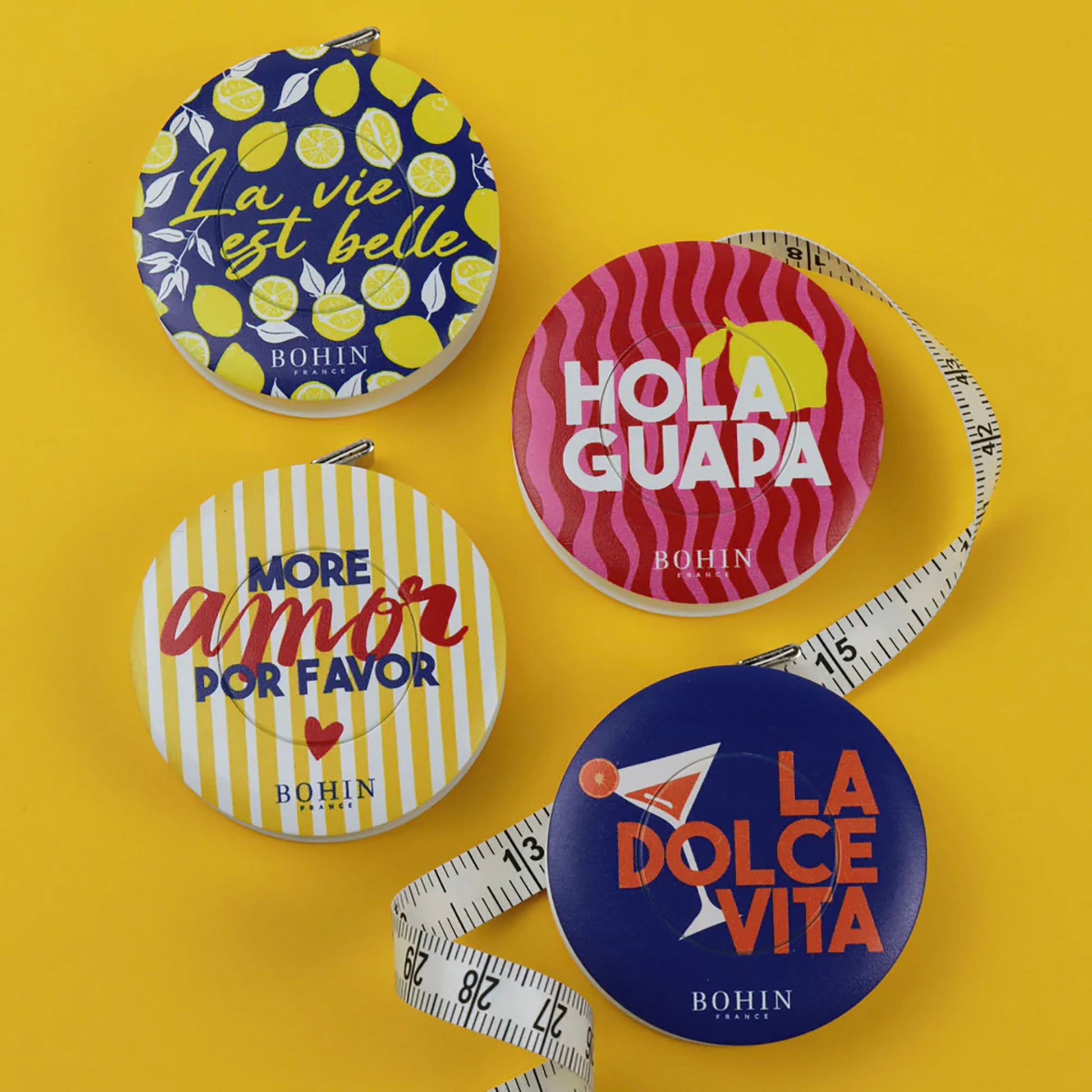 Glissez un peu de joie de vivre et de vacances dans votre trousse à accessoires ! Avec leur graphisme original aux couleurs vibrantes, les mètres-ruban de la collection Dolce Vita de Bohin sentent bon l'été.