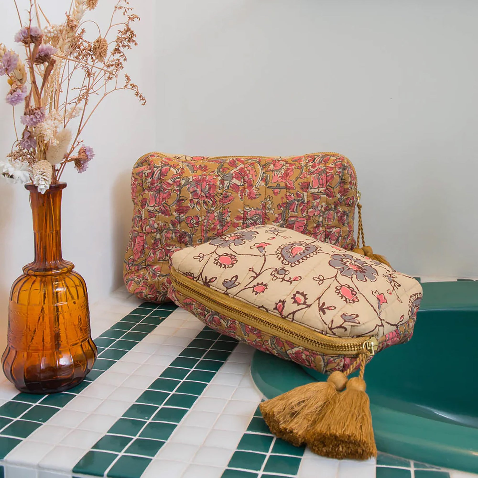 En effet, ces grosses trousses moëlleuses, à l'aspect si doudou avec leur matelassage, protègeront vos en-cours en beauté. Les tissus fleuris choisis pour les fabriquer, entre inspiration liberty et coton indien, renforcent encore cette impression de douceur. Et leur gros pompon coloré, fait à la main, leur donne un petit côté fantaisie très sympathique ! De plus, si vous emportez vos projets partout, la doublure de certains modèles a reçu un traitement déperlant. Ainsi pas de risque de retrouver vos projets trempés si votre gourde se renverse au fond de votre sac cabas !